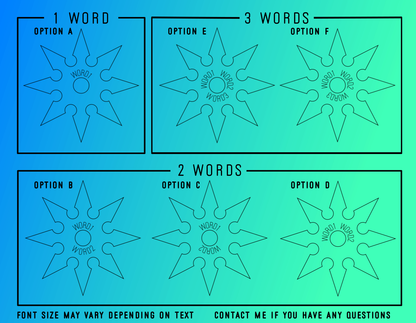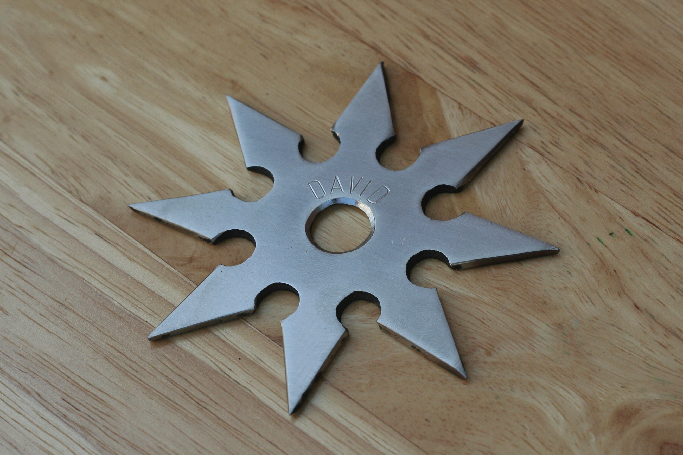 Introducing our Personalized 8-Sided Ninja Star - the ultimate weapon for the modern ninja. This Ninja Star is handmade from high-quality 12 gauge (0.1094" thick) stainless steel and has a diameter of 4 inches. Please note that as each Ninja Star is individually handcrafted, there may be slight variations in size. The surface finish on the stainless steel is not perfect because each ninja star is hand finished not machine finished. You may notice some scratches or marks on the surface of the Ninja Star, but this only adds to the authenticity of the piece. While the blades of the Ninja Star are not sharpened, the craftsmanship is still of the highest quality. It is cut from raw material, finished, and engraved using our own in house equipment. This Ninja Star is designed to be a stunning display piece that showcases your love for martial arts and Japanese culture. What sets our Ninja Star apart is the ability to personalize it with your own custom engraving. This Personalized 8-Sided Ninja Star is perfect as a unique gift for friends, family, as a corporate gift, or as a stunning addition to your own collection. Add it to your cart now and become the ultimate warrior!